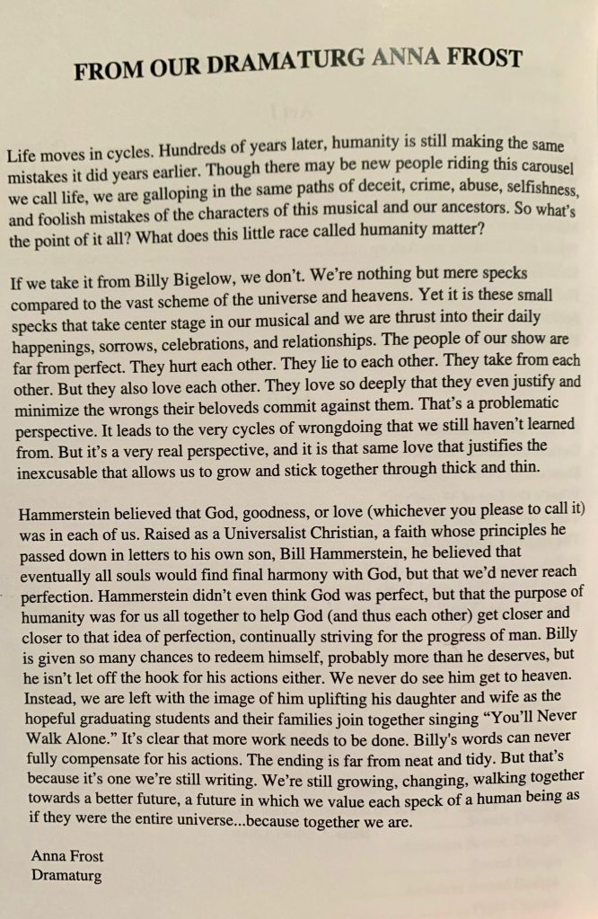 Below is a portfolio of dramaturgy work I completed for PtC’s production of Rodgers and Hammerstein’s Carousel.
